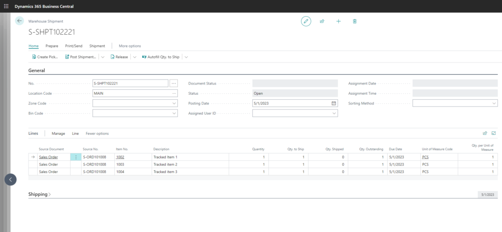 Then I have to create a Sales Order and from the Sales Order a Sales Shipment in Business Central: